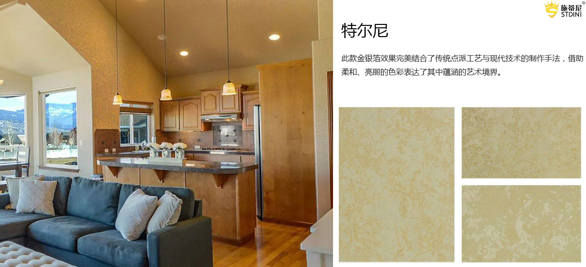 施蒂尼生态艺术壁材在追求自然装饰个性化风格同时,全面使用水性环保材料制作,而且突破传统材料只追求色彩的局限,能在平整的表面中展现凹凸的质感和丰富的纹理变幻效果,能够将平庸的墙面变为一幅神奇的大师画作,具有大自然玉石般的晶莹,剔透着生命的活力。